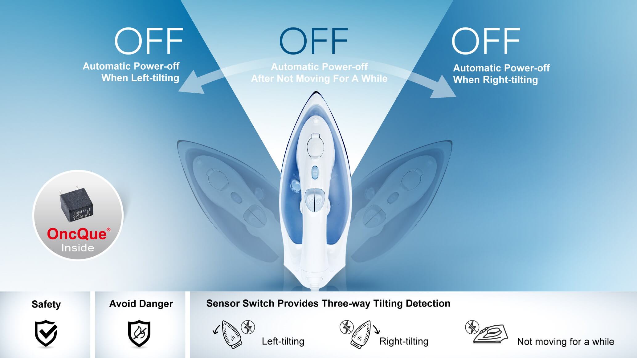 Install a shock sensor on irons, shock sensor provides ON/OFF signal continuously when user keep using irons, irons will keep working at this situation; once the signal maintains at ON or OFF signal for a certain time, irons will be automatic power-off by program design in order to prevent dangers.
